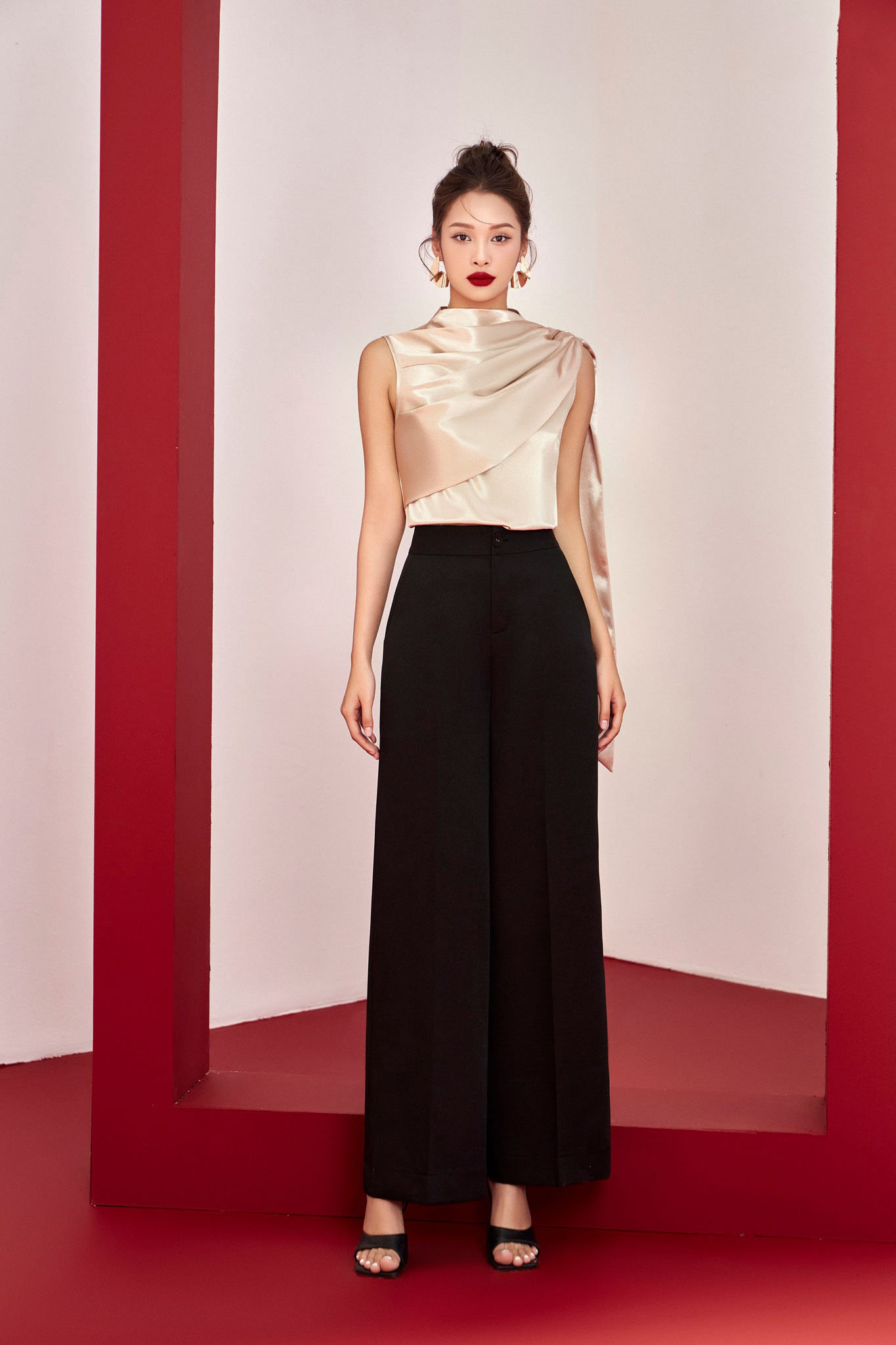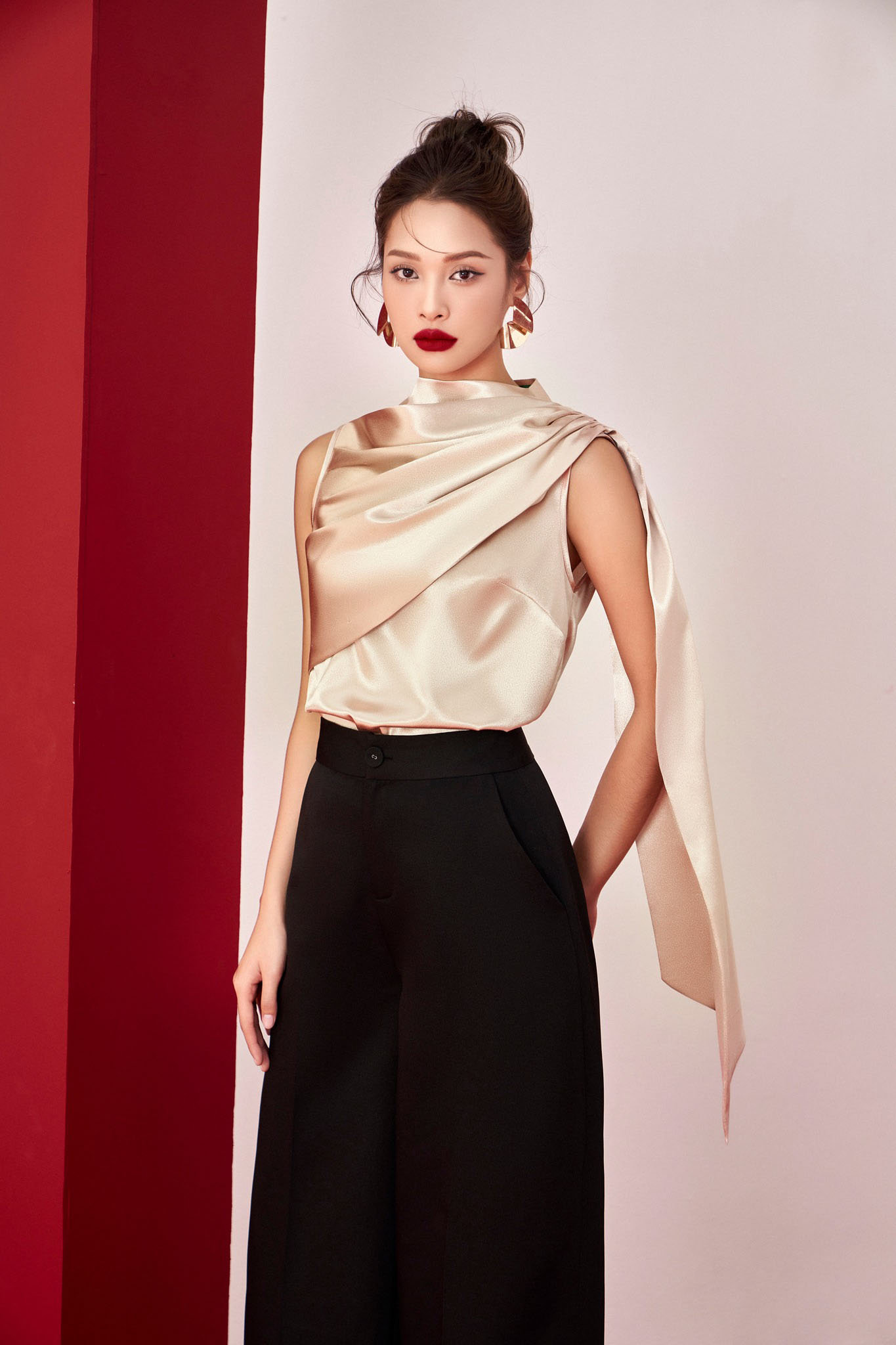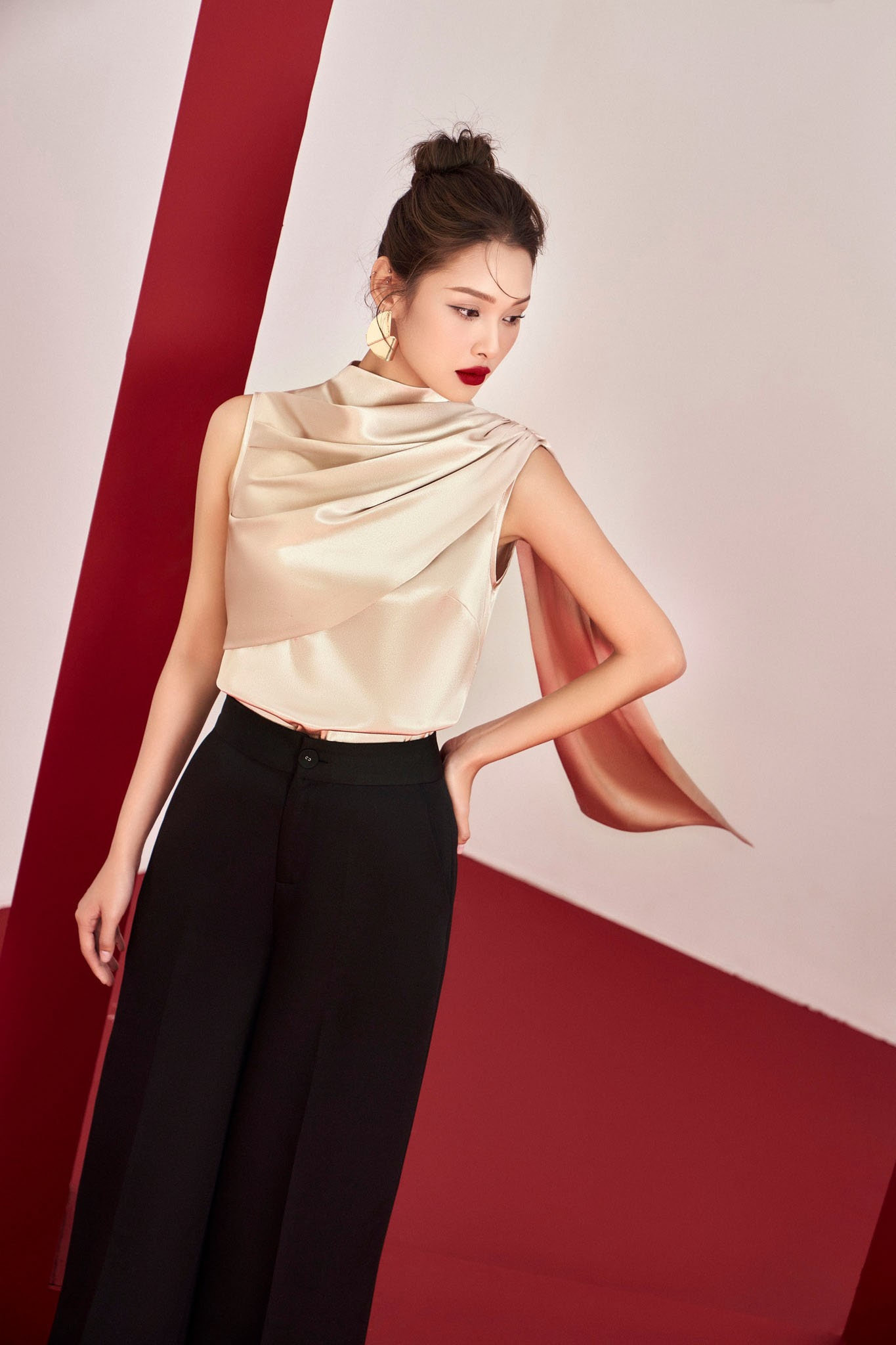 This exquisitely designed champagne-colored satin blouse boasts flowing, unforgettable lines. The smooth, lightweight fabric hugs the body, while asymmetrical layering creates soft, flowing folds. Striking drapes adorn the shoulders, cascading down the back for added dynamism with every step, creating a runway-model-like, graceful movement. The sleeveless design and clean, flowing lines make it the perfect choice for evening events, formal occasions, or any setting that demands a modern and sophisticated look.