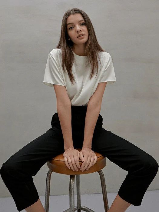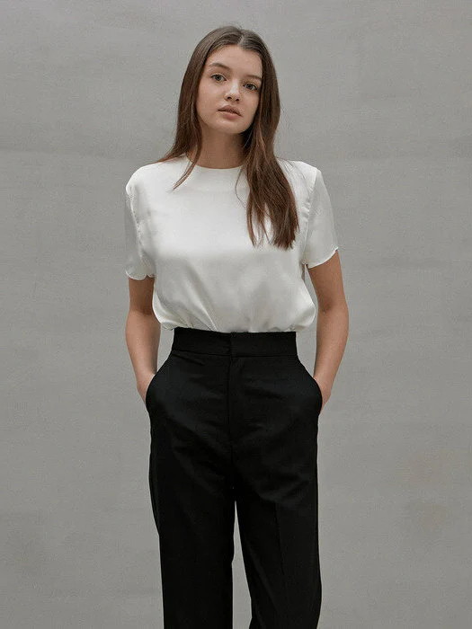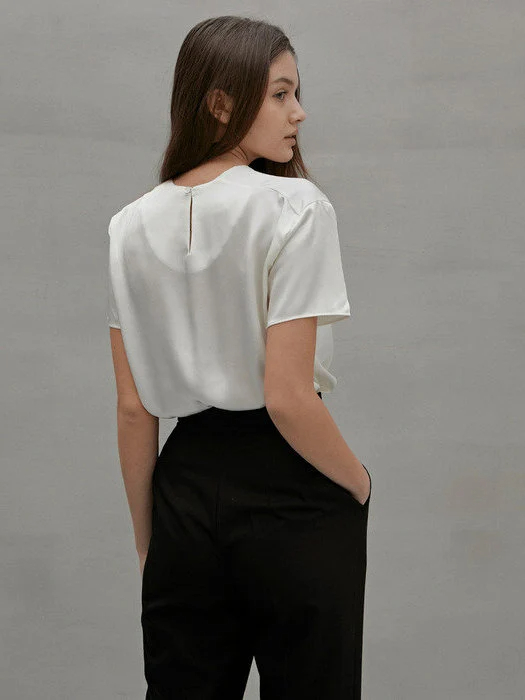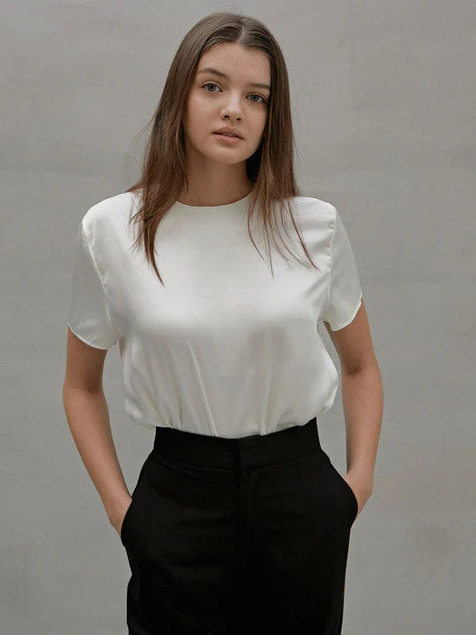 This ivory satin shirt is simple, elegant, and easy to match, making it a must-have for both weekdays and weekends. The smooth, lightweight fabric drapes beautifully, showcasing a refined style while offering the comfort of a T-shirt. The simple crew neck and short sleeves make it a classic and versatile piece, easily adaptable to various occasions.
