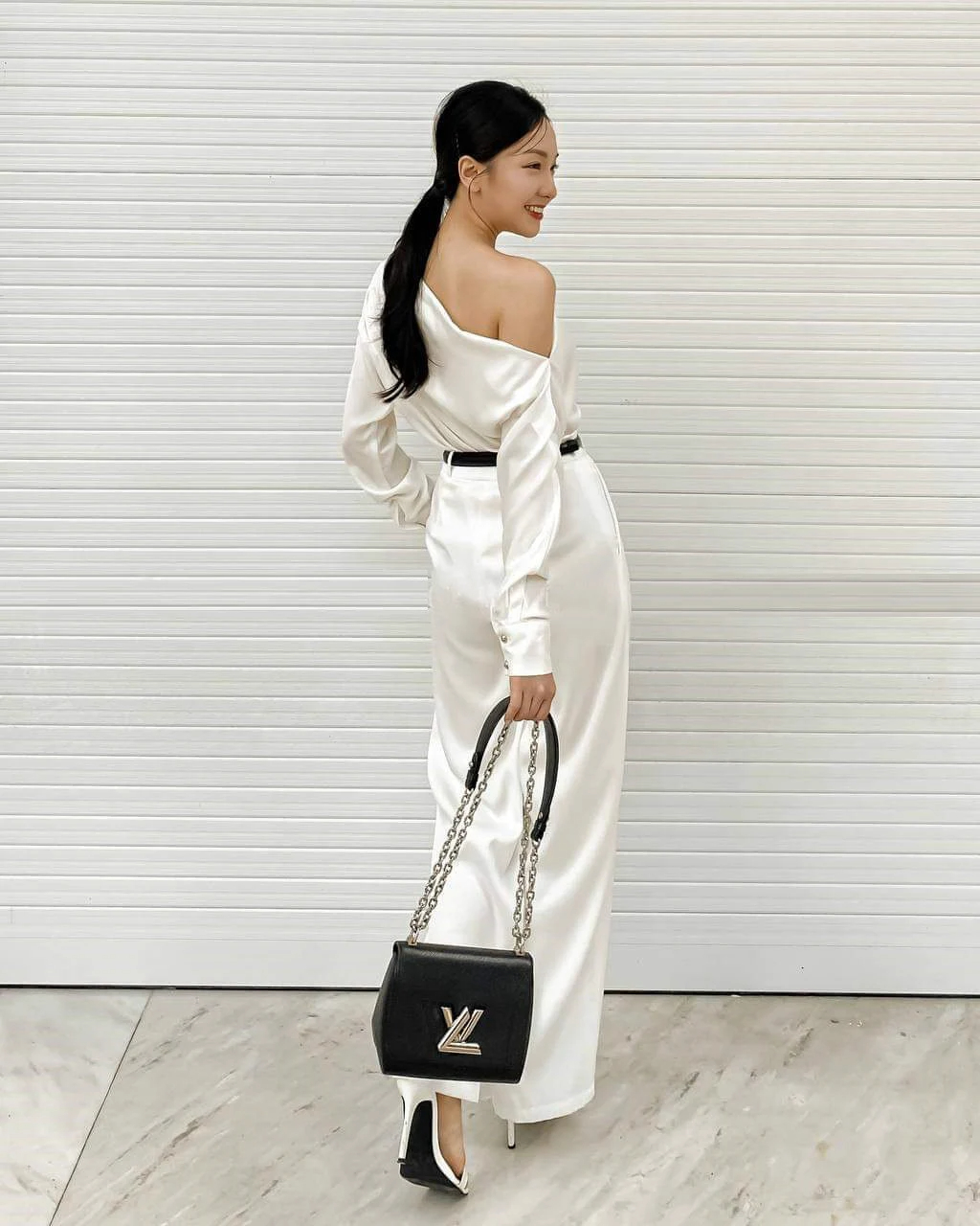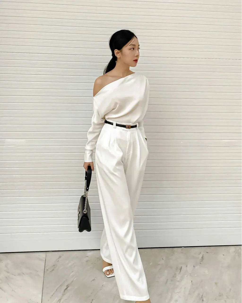 This one-shoulder satin blouse boasts sleek lines and a modern, stylish look, effortlessly creating a captivating silhouette. The smooth, lightweight satin fabric hugs the body, while the asymmetrical neckline accentuates the collarbone and shoulders, showcasing feminine grace. The relaxed, draped fit, paired with fitted long sleeves and button-down cuffs, perfectly balances softness and structure, making it an ideal choice for evening outings, special occasions, or sophisticated everyday wear.